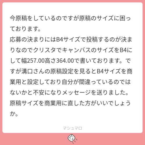 私もまったく同じことで不安になってた時期があります!笑 数年前に書いた記事がありますのでよろしければそちらを… www.mizoguchinano.work もしも現状B4で作画まで進めてしまった場合、描き直す必要はないと思います。 小さいサイズを拡大して印刷すること…