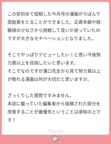 初投稿で奨励賞!すごい! おめでとうございます! 努力賞以上がとれる漫画は何が大切か…。 基礎的な部分は批評シートなどにお任せするとして…。 (批評シートは忘れた頃に届くので、ガンガン次の作品に取りかかっちゃいましょ) 今パッと頭に浮かんだのは …
